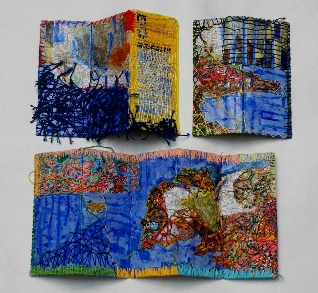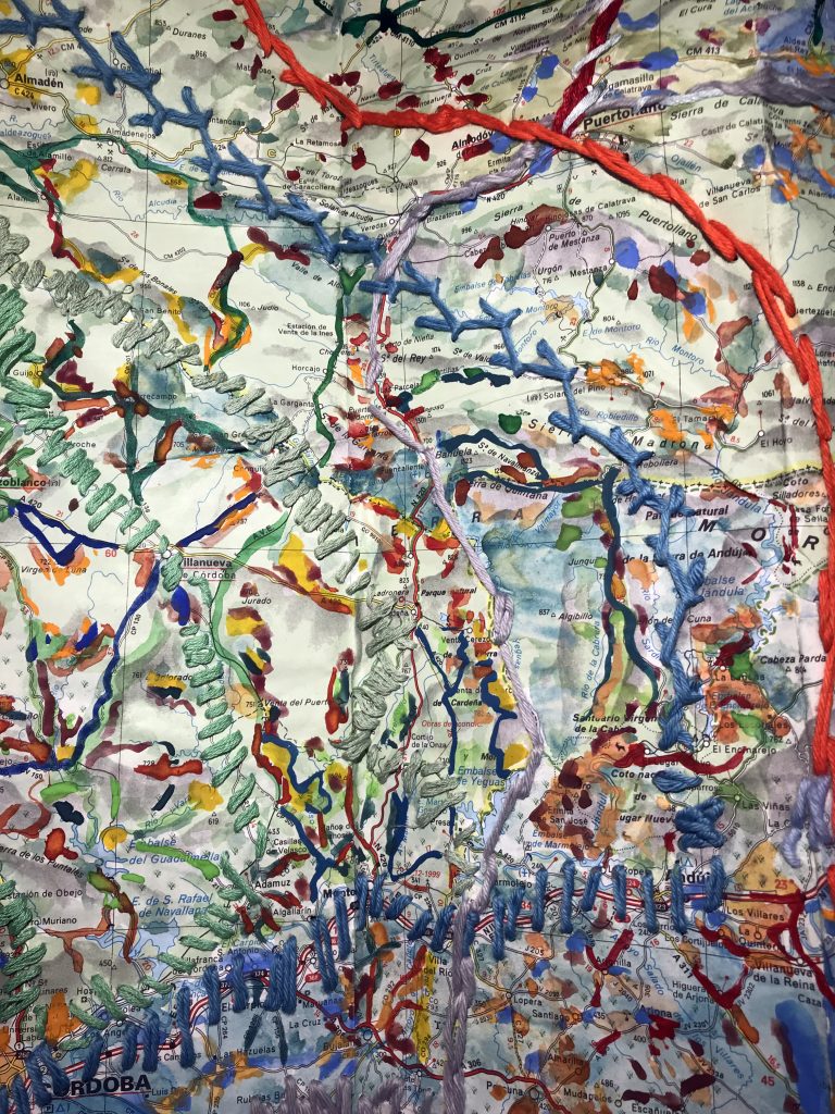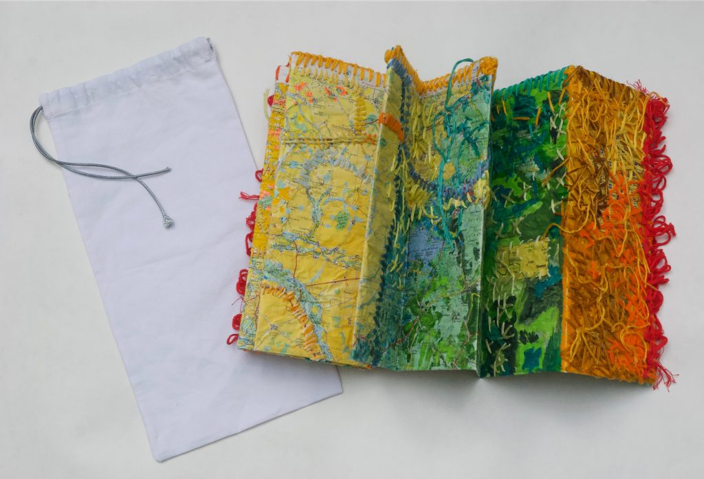 Mes cartes deviennent œuvres magiques qui se lisent tel des livres, avec méandres et rebondissements. Mes cartes dans leur sac de toile s’emportent et se posent, point d’ancrage là où l’on se trouve.