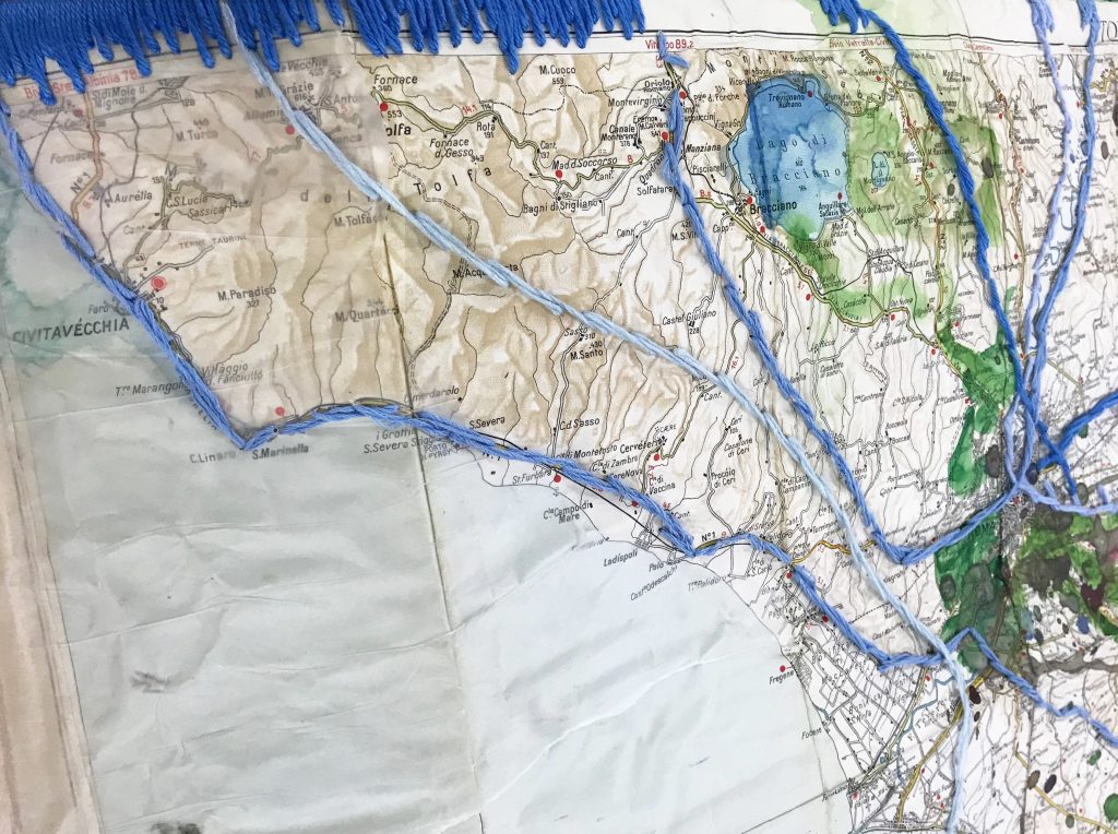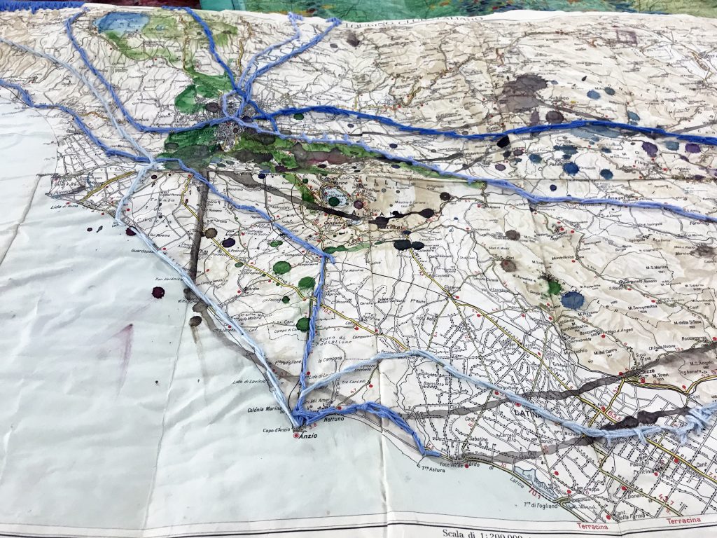 Je maroufle ROMA, carte du Touring Automobile Club avec du papier claque. Elle se consolide et en même temps semble vieillir. C’est la première fois que le papier réagit ainsi. Je choisis de ne pas revenir avec l’aquarelle. Je dessine des routes et des lignes, toujours en bleu. Ce bleu du ciel si grand, si fort qu’il prend toute la place.