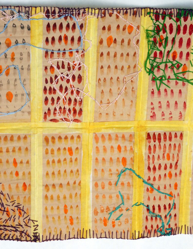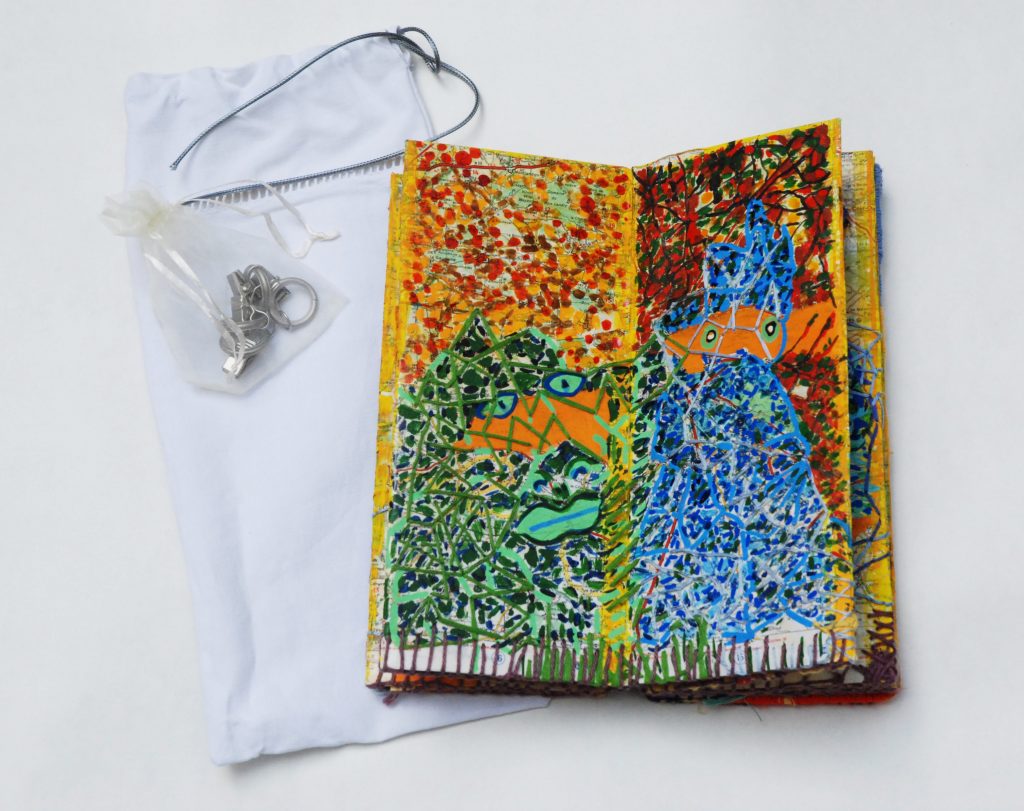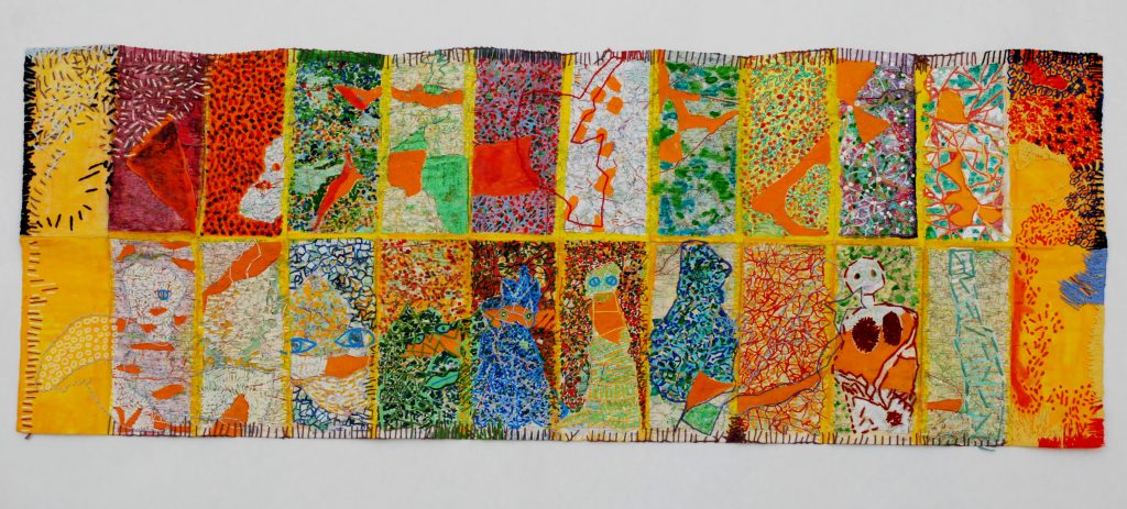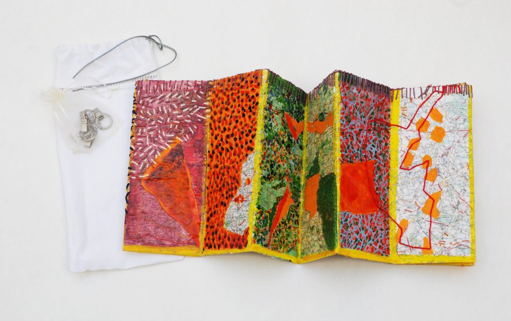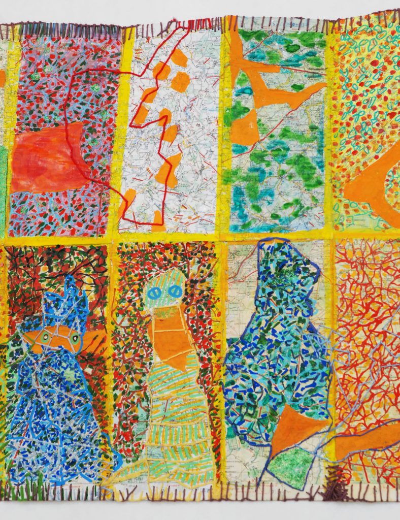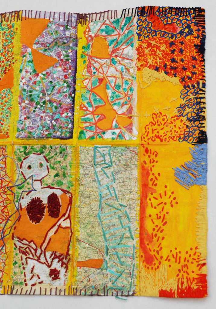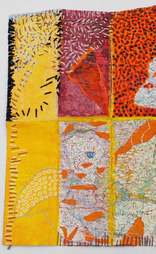 2018 – Les Dieux sont parmi nous Carte semi pliée et son pochon de voyage Carte pliée et son pochon détail détail Carte marouflée sur carton – Recto/verso – Mixed Media – Broderies Carte pliée et son pochon détail Détail détail Recto